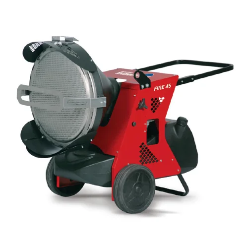 Despite its robust construction and substantial heating capacity, the Fire 45 industrial heater maintains convenient portability thanks to integrated oversized wheels and lifting hooks. Workers can easily reposition this heater around sites to redirect warmth where required. The tilting head further enhances adaptability, angling the heat output precisely as desired.